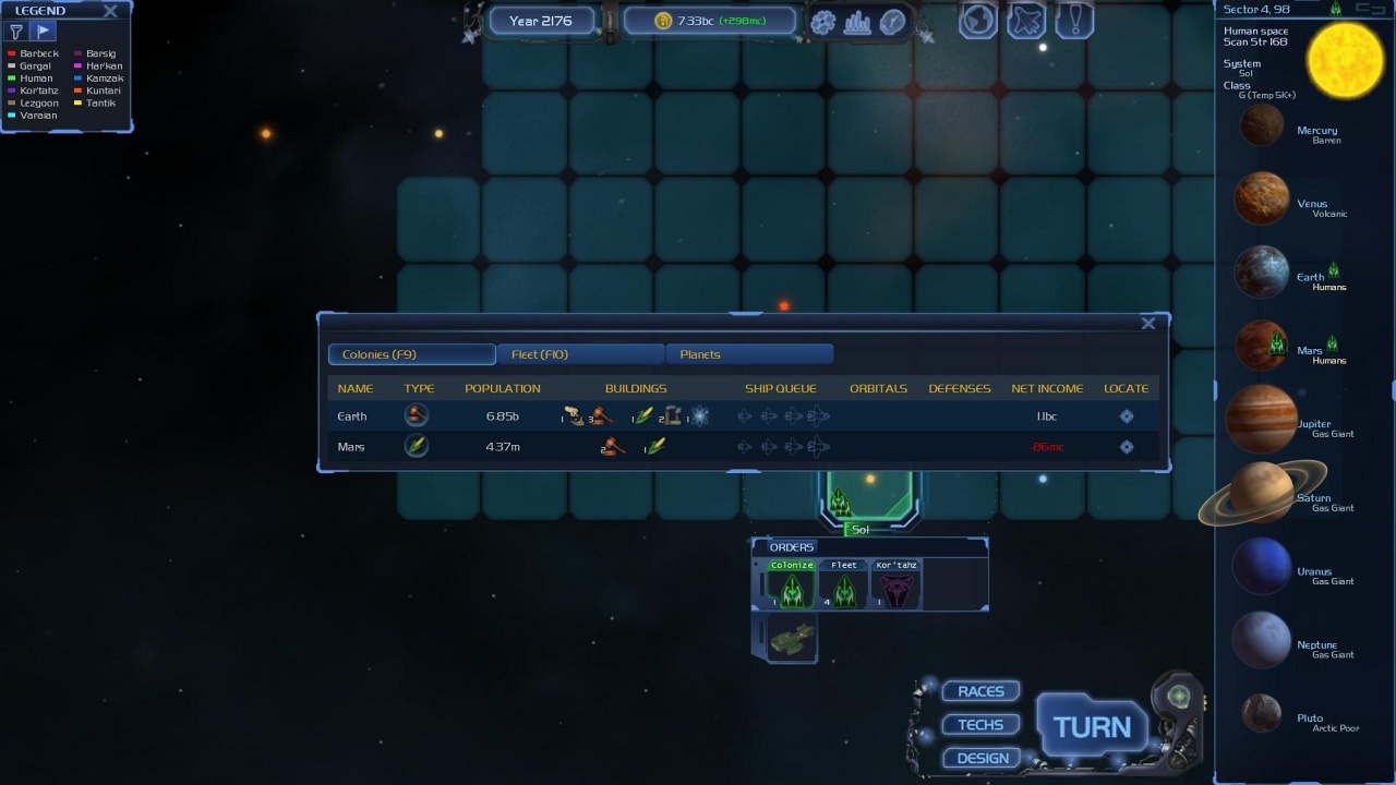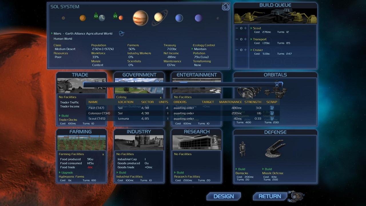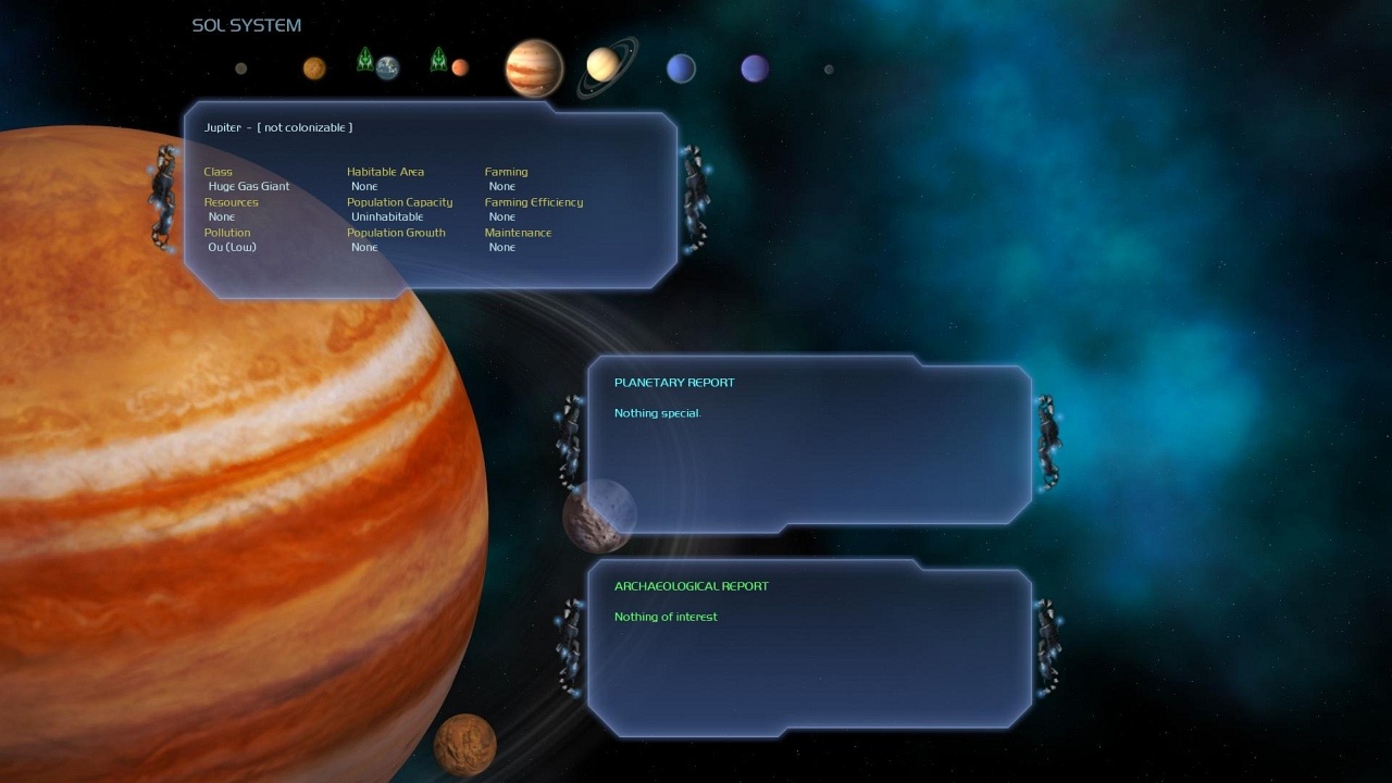 Apropó, bolygók. Sokféle van belőlük, ám alapjáraton csak néhány típusú kolonizálható. Emberként nyilván a földszerűek a legjobbak – másféle bolygókat ugyan gyarmatosíthatunk, de lesznek amolyan „büntetések”, például kisebb maximális populáció, kevesebb termelhető kaja és így tovább. Bolygóinkra építhetünk is, nyolcféle kategóriából választhatunk épületeket, amelyek lehetnek kormányzati, kutatás-fejlesztési vagy mezőgazdasági létesítmények. Mivel minden bolygó más, ezért itt is specializálhatunk planétákat akár szórakoztatásra, akár iparra, ami szintén remek ötlet. Később bejön a terraformázás lehetősége is, amellyel lakhatatlan bolygókat is lakhatóvá tehetünk bizonyos korlátozásokkal.