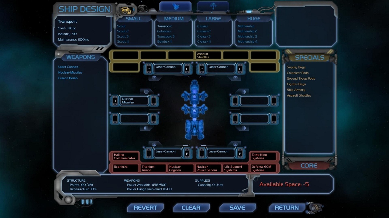 Gyártani többféle űrhajót tudunk, és nagyon jópofa, hogy a típusokat teljesen testre szabhatjuk: egy adott osztályú hajóra, melyből van több is, adott mennyiségű cuccot rakhatunk. Ezek lehetnek fegyverek (kicsi, közepes, nagy lézer, bombák stb.), de sok hasznos egyéb felszerelés is van: hajók elfoglalásához használható kisebb űrhajódokk, kolonizáló felszerelés és így tovább. Ez azért szuper, mert teljesen egyedi, funkcionális flottát csinálhatunk, semmi megkötés nincs. A típusainknak nevet is adhatunk, aztán mehetnek is gyártásba. Ez utóbbit a bolygóinkon tudjuk megtenni, és persze minél összetettebb a hajó, annál több körbe (és pénzbe) kerül.
