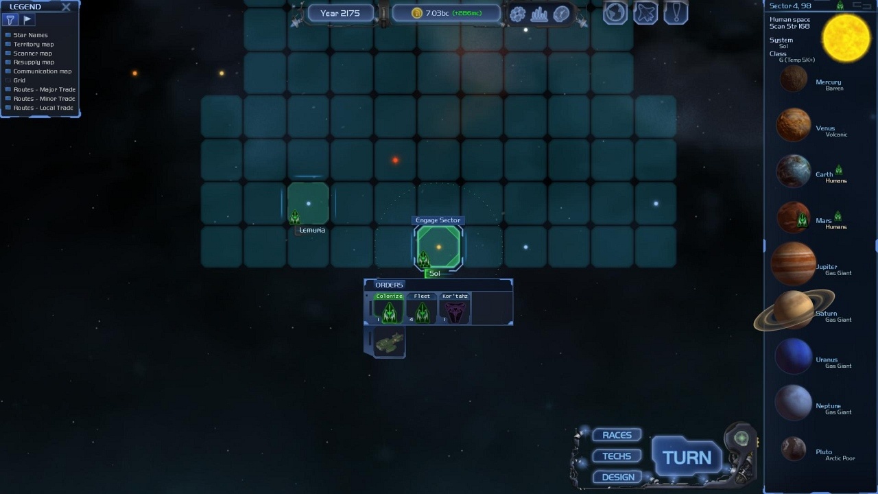Tutorial nincs, pedig kéne. Pár küldetésen keresztül gyorsan megtanulunk gyártani és kutatgatni, mozgatni az egységeket, és ennyi, lehet belevágni az űr meghódításába. Őszintén szólva ez egy kicsit gyors tempó, nekem kellett jó pár óra, amíg össze tudtam rakni, hogy mi hogy van, pedig alapvetően logikus a játék felépítése, csak egy részletesebb oktató rész nem ártott volna. Űrstratégiákban jól megszokott módon van egy csillagtérkép, amelyen most naprendszereket látunk, amelyek természetesen bolygókkal rendelkeznek. A terjeszkedéshez kolonizálnunk kell, fejleszteni és gyártani, szóval a tipikus 4X-sémát követi a játék.