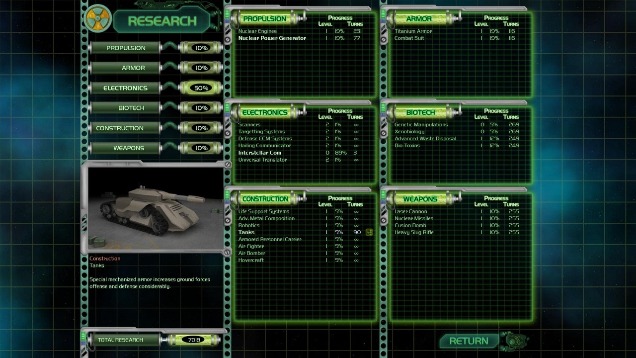 A kutatás-fejlesztés minden űrstratégia alapja, és itt is kulcsfontosságú szerepet tölt be. A különböző kategóriák (például elektronika) alá sokféle fejlesztés tartozik. A kutatás gyorsasága birodalmunk K+F kapacitásától és népünk képességeitől függ, de szerencsére lehetőség van egy-egy technológiára fókuszálni, ha valamire sürgősen szükségünk van. A kifejlesztett eszközöket aztán pakolhatjuk hajóra, felépíthetjük, típusának megfelelően. Érdekes rendszer amúgy, ahhoz, hogy teljesen új technológiákat kifejleszthessünk, „áttöréseket” kell elérnünk, ami nem kiszámítható módon érkezik, viszont kulcsolhatunk értük más civilizációknál, de akár ősi romokat is átkutathatunk.