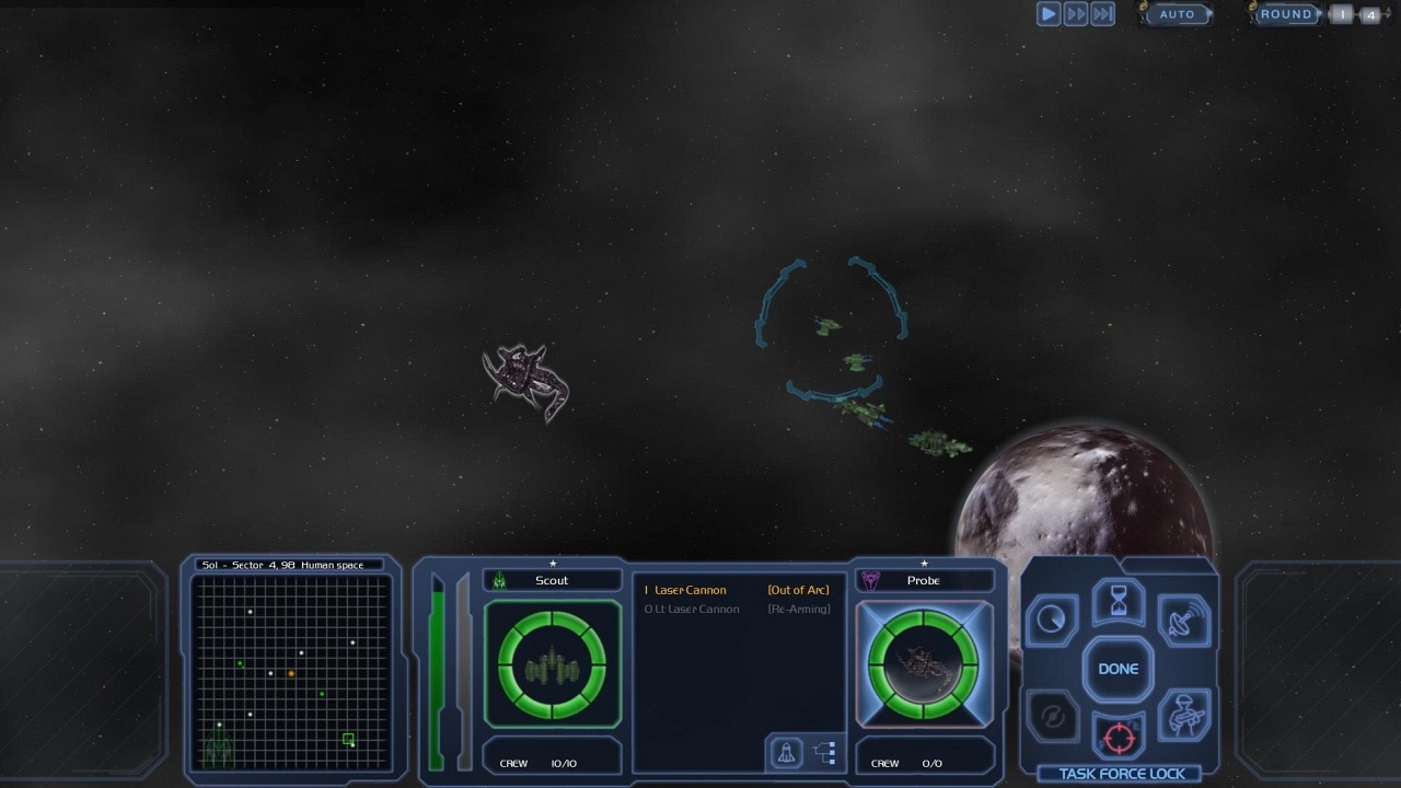 A harcot meglehetősen érdekesen oldották meg, és sajnos ez az a pont, ahol a Horizon némileg elbukik. Amíg a stratégiai rész a csillagtérképen zajlik, a taktikai rész egy adott naprendszert (szektort) mutat. Bármikor kiadhatjuk a parancsot egy szektor megközelítésére, ami után a taktikai rész jön be. Ha egy adott szektorban vannak egységeink, akkor itt mindegyik mozgathatóvá válik. Mivel egy szektorban több hajónk is állomásozhat, igazán grandiózus csatákat lehetne elvileg lejátszani. A probléma azonban az, hogy minden körben egyenként kell kiadni a parancsokat. Ettől az egész rettenetesen elnyújtottá válik, és mivel a szomszédos szektorokból is tudunk bevonni űrhajókat, végeláthatatlan csatákba bonyolódhatunk. Persze van automatikus lejátszás is, de ez is akár fél órákat vehet igénybe, és ahogy lenni szokott, a játékosnál sokkal rosszabb eredménnyel zárja őket. Nem értem, hogy miért nem oldották meg ezt valahogy, kicsit gördülékenyebbé tehették volna a dolgokat, mert a mikrózás alapvetően jó dolog, de itt egyszerűen bosszantó. A csata közben szóló háttérzene pedig egyszerűen rettenetes.