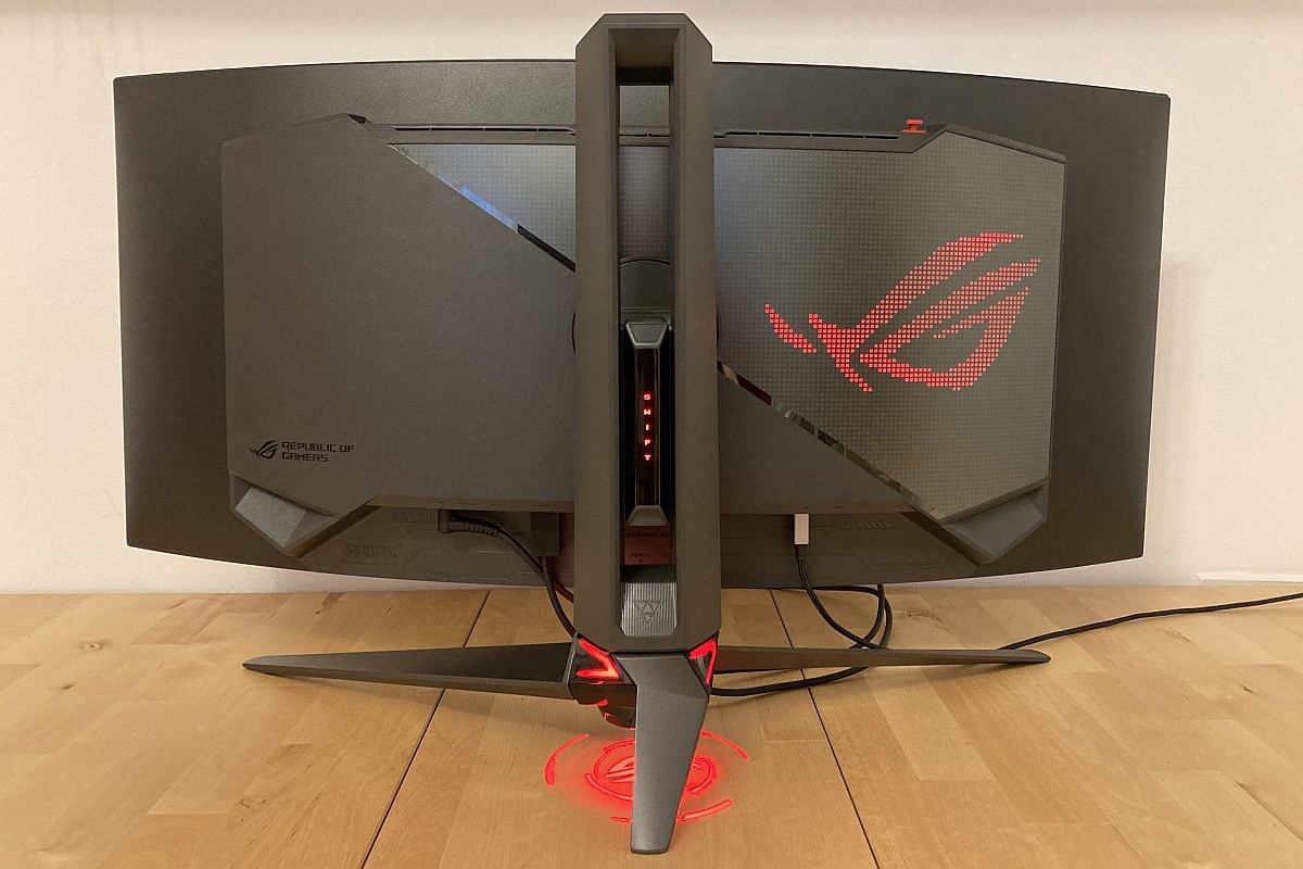A nyak tág határok között állítható, és még egy ROG-logót is képes az asztalra vetíteni. Aura Sync kompatibilis ROG-embléma került a hátlapra is – ennek a designja emlékeztet a G14 laptopok AniMe Matrix kialakítására, így valahol egy kicsit kihagyott ziccernek érzem, hogy nem ez került oda. Maga a kialakítás meglehetősen vaskos lett, de ennek oka is van: a belső komponensek hűtését úgy alakították ki, hogy csökkentsék a panelbeégés veszélyét.