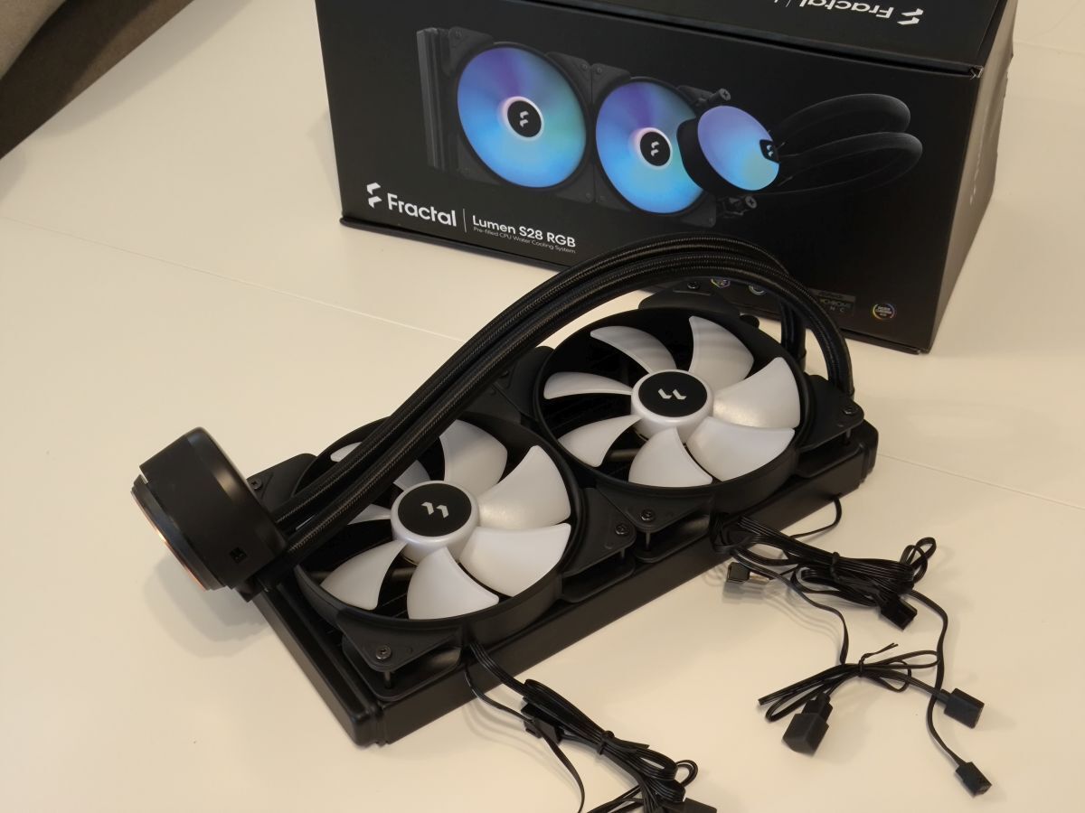 Egy alkatrész erejéig még visszatérnék az építésre. Külön érdekesnek ígérkezett ugyanis számomra a Fractal Designtól kapott másik termék, a Lumen S28 RGB folyadékhűtés, egy AIO, azaz all-in-one megoldás. A doboz legnagyobb részét a 280 mm-es radiátor foglalta el, amelyet két harisnyázott cső köt össze a processzorra kerülő hűtőegységgel. Kényelmes belépő ez a vízhűtés világába, nem kell a csövekkel és a folyadékfeltöltéssel foglalkoznunk, mindössze a két nagy ventilátor felszerelése várt rám a kicsomagolás után. (Igaz, aztán sikerült figyelmetlenségből az egyik kábelt kihagyni, aminek köszönhetően a procin lévő rész világítását mellőznöm kell. A csatlakozó elhelyezkedése miatt utólag már macera lett volna rákötni, ezért úgy döntöttem, marad ez most így, nem bolygatom meg az amúgy jól működő rendszert.)