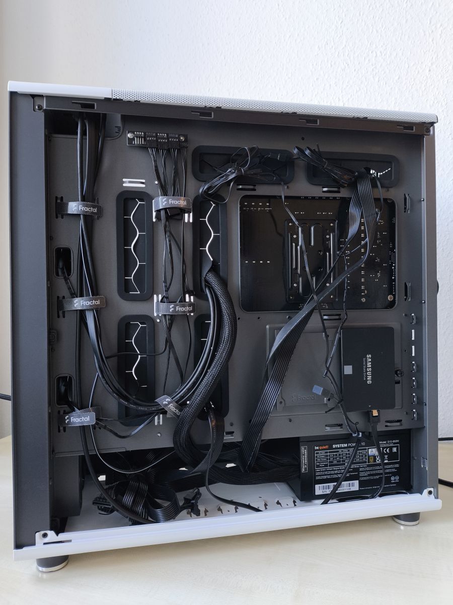 Az alaplap becsavarozása után következett a kábelek első adagjának csatlakoztatása. Igyekeztem mindent úgy terelni, hogy az üvegfalon át ne nagyon látszódjanak a drótok, és ez úgy érezem, elég jól sikerült is. Igaz, az üveggel ellentétes oldalon sok vezeték fut, de azok elvezetését segíti a vázhoz gyárilag rögzített sok tépőzáras szalag is. Egy részük mondjuk alapból is számos kábelt fog már össze: a három előre beépített ventilátoréit – ezek egy felső részre szerelt, de akár máshova is áthelyezhető elosztóba vezetnek –, valamint a ház felső részén lévő I/O-egység drótjait. A kábelek elvezetésére fenntartott „hátsó” (az alaplap mögötti) részen kapott helyet amúgy egy fémlemez, amely két 2,5”-es meghajtó elhelyezésére szolgál, azaz elsődlegesen hagyományos SSD-ket pakolhatunk oda.