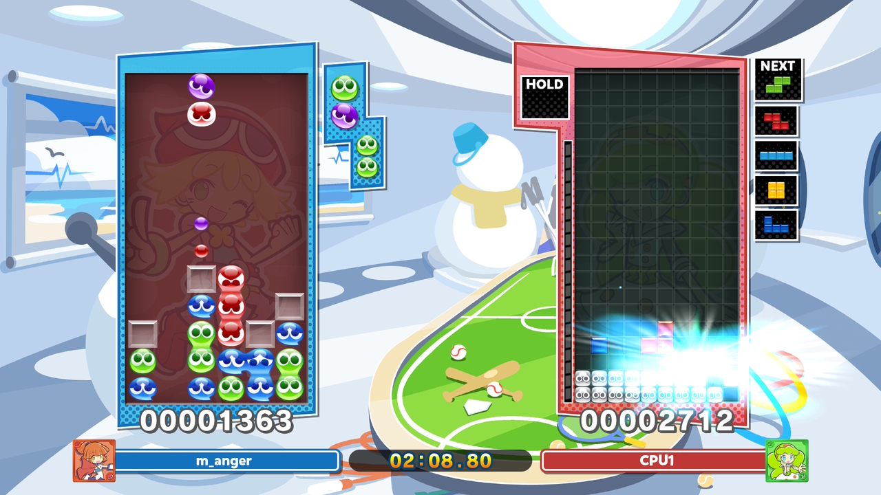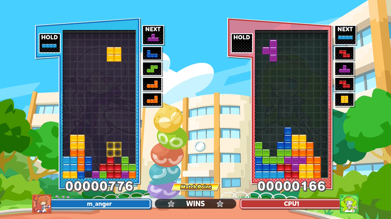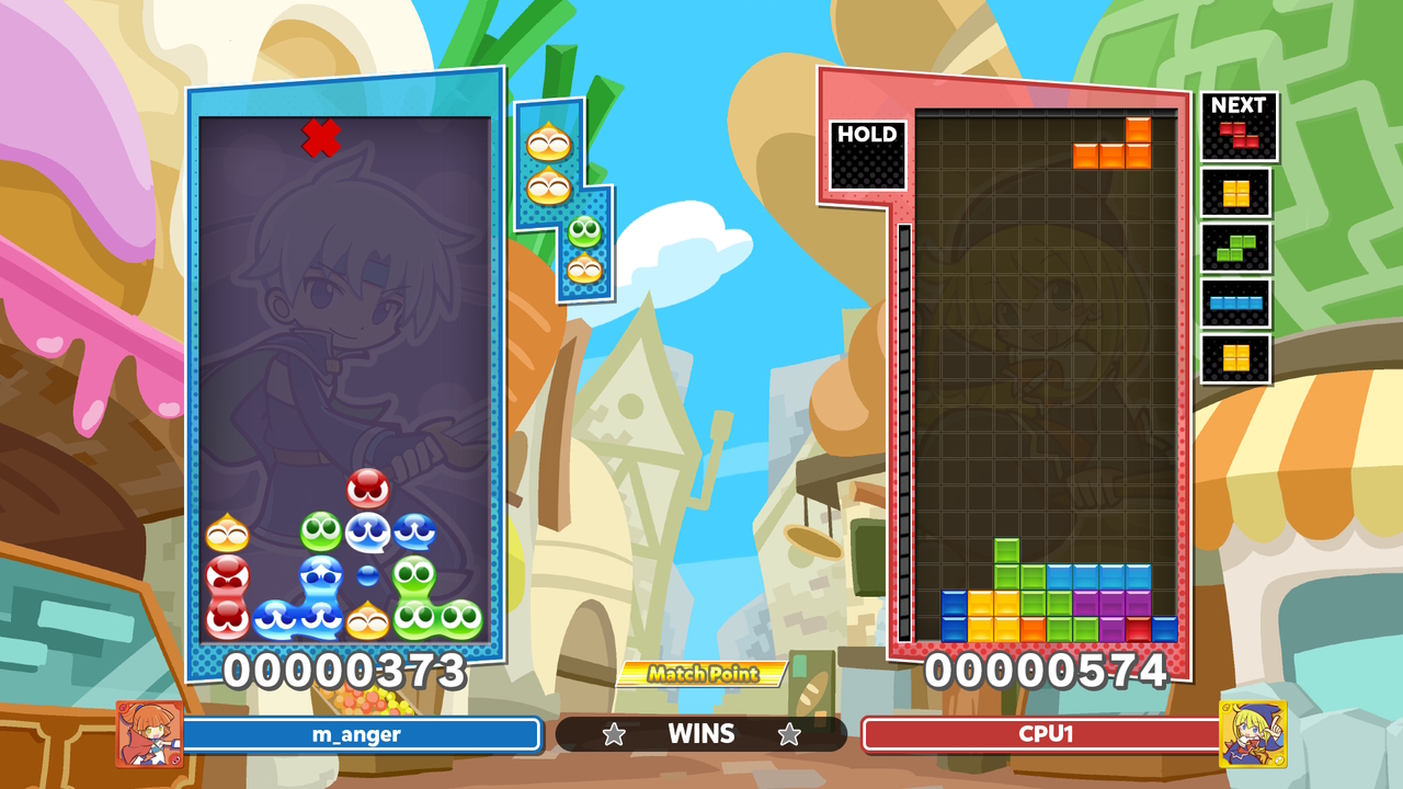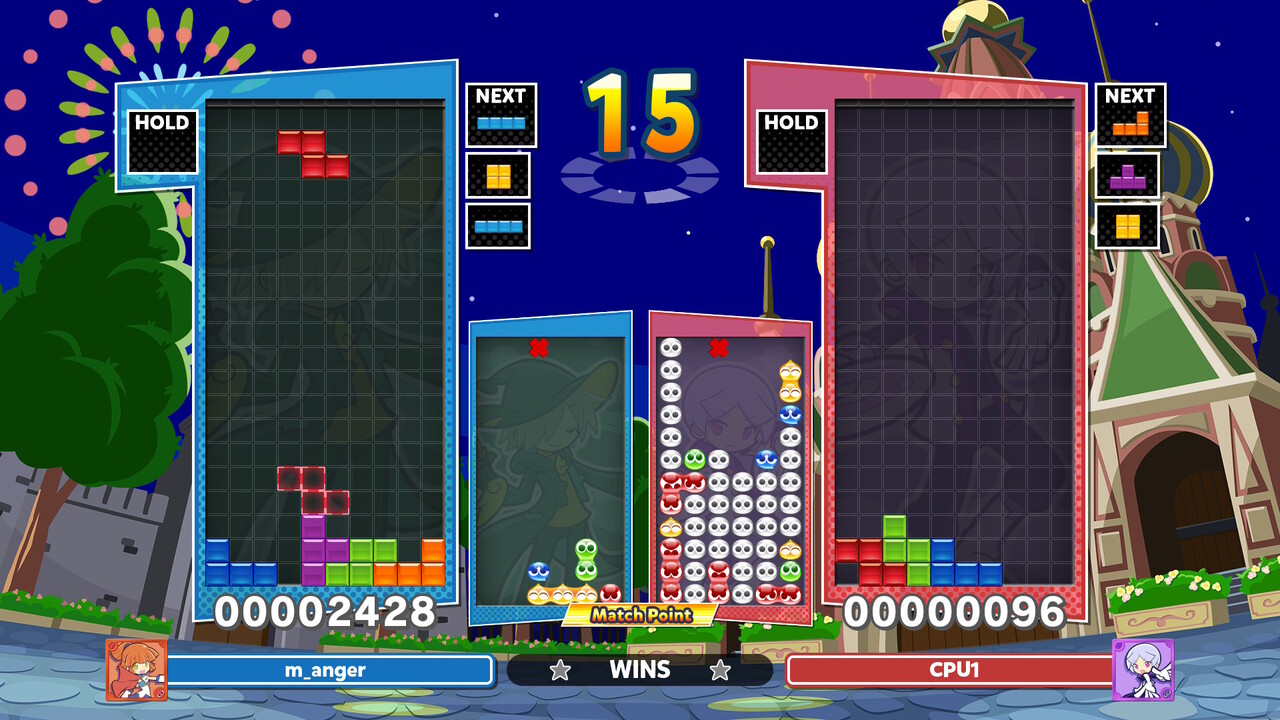 Az alapötlet (ahogy fentebb is írtam) kifejezetten érdekelt, és az elején szívesen is vettem a két játék közti váltogatást. Alapvetően ugye olyan címről beszélünk, ahol egymás ellen kell küzdeni a képernyőn egy másik (gépi vagy humán) játékossal, és sorokat kell eltüntetni a játékmezőből – akinek hamarabb megtelik, veszít. Az is izgalmas volt, amikor ugyanazt toltuk, az meg pláne, amikor felemás módon ment a megmérettetés (egyikünk Tetrist, a másik meg Puyót játszik). Az meg kifejezetten kihívás, amikor a kettő menet közben keveredik. Vagy úgy, hogy felváltva kell mindkettőt játszani, vagy akár egyszerre, egy meneten belül jön mind a kétféle elem.