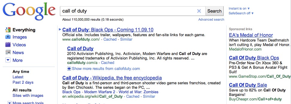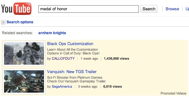 Egyáltalán nem titok, hogy az ipar két legnagyobb kiadója, az Activision és az Electronic Arts folyamatosan egymás nyakát szorongatják, most még jobban, mint valaha. A Medal of Honor és a Call of Duty sorozat párbaja különböző rendezvényekről, internetes fórumokról és a gamer magazinok hasábjairól most úgy néz ki, hogy a Google-re is átterjedt, legalább is az USA-ban. Az EA nem titkolt célja, hogy az új Medal of Honorral a vetélytárs babérjaira törtjön, ám az Activision a Black Ops-al kemény visszavágásra készül. A TechStockJungle munkatársai érdekes dologra lettek figyelmesek egy rutin Google keresés közben. Ha a Call of Duty névre kerestek rá, akkor a fizetett Google Ads hirdetések között első helyen a Medal of Honor bukkan fel, viszont ha Youtube-on (ami ugyancsak a Google Ads rendszerét használja) kerestek rá a Medal of Honor-ra, akkor viszont Call of Duty hirdetéseket kaptak az arcukba. Felmerül a kérdés, hogy mennyire etikus ez a fajta harc, hogy egymás keresési találataiba csempészik be a saját címeiket, de úgy néz ki, hogy háborúban nincsenek szabályok.